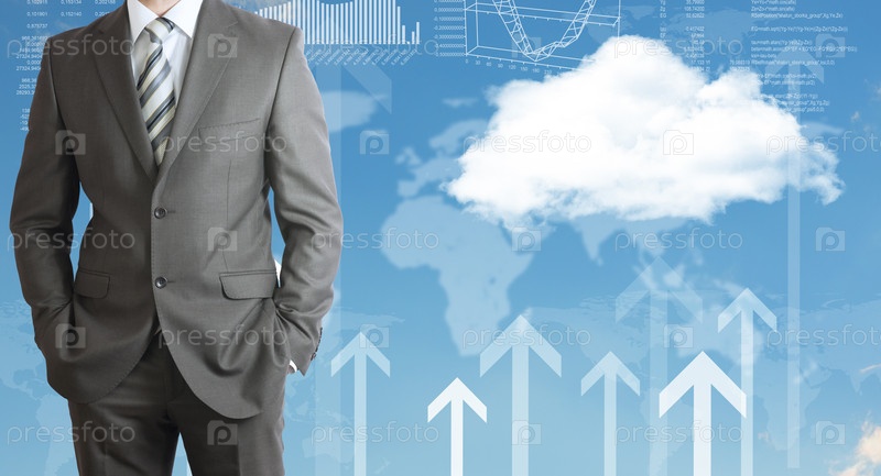 Бизнесмен, карта мира, облака и графики