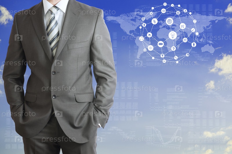 Бизнесмен в костюме и карта мира