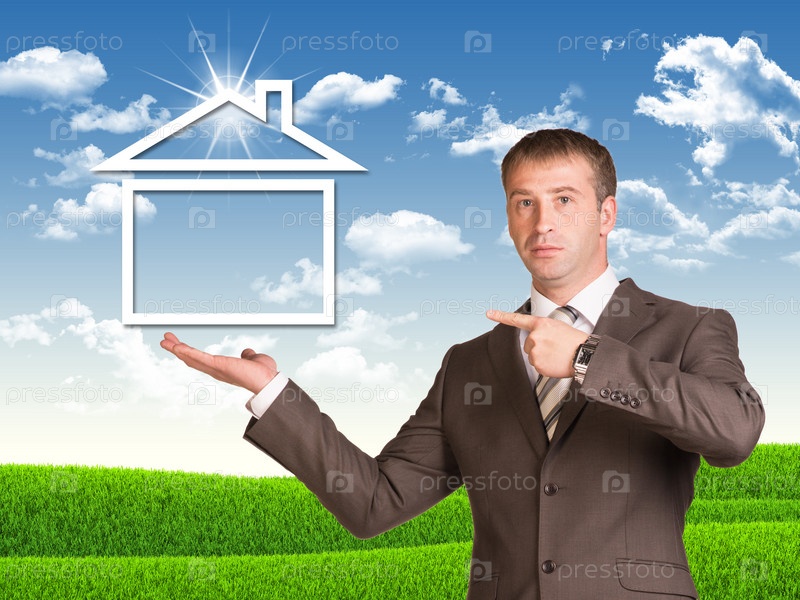 Бизнесмен в костюме держит значок дома