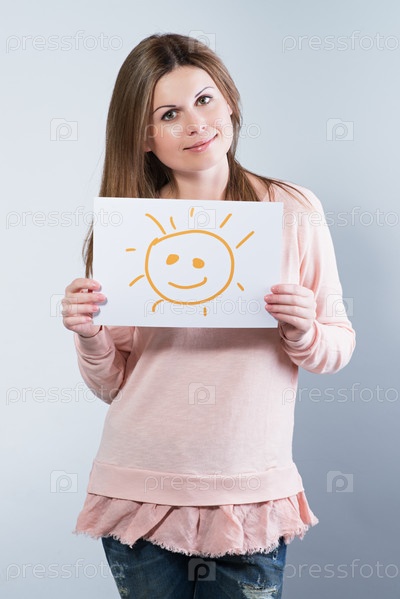 Женщина, держащая лист с нарисованным солнцем