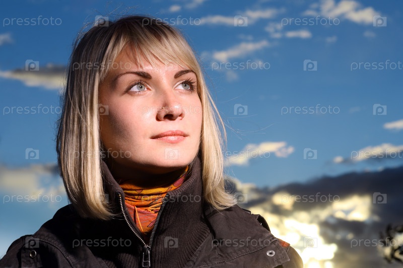 Красивая блондинка на фоне голубого неба