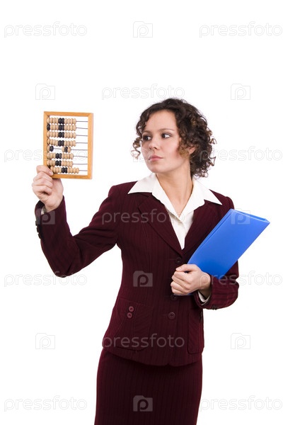 Портрет улыбающейся деловой женщины, держащей деревянный абак.Молодая привлекательная девушка использует абак.Изолирована на белом фоне