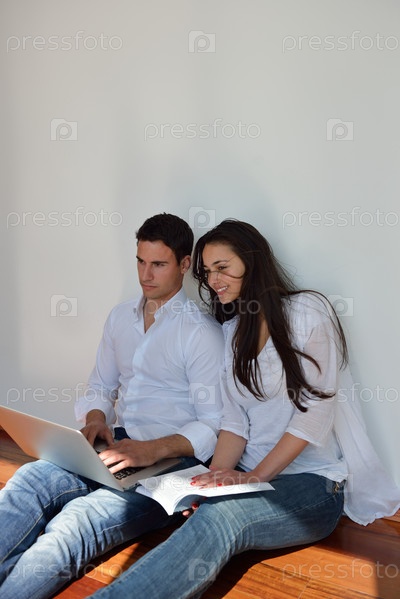 Молодая пара работает на ноутбуке