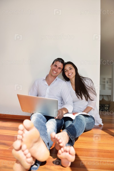 Молодая пара работает на ноутбуке