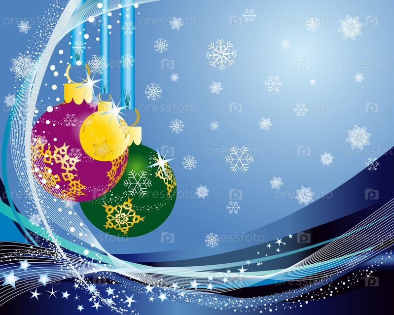 Снежинки и елочные урашения на голубом фоне