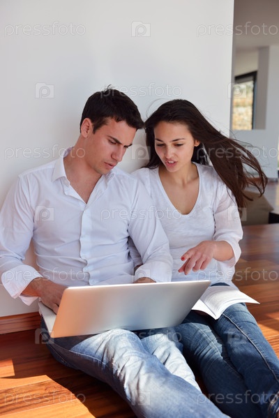 Молодая пара работает на ноутбуке