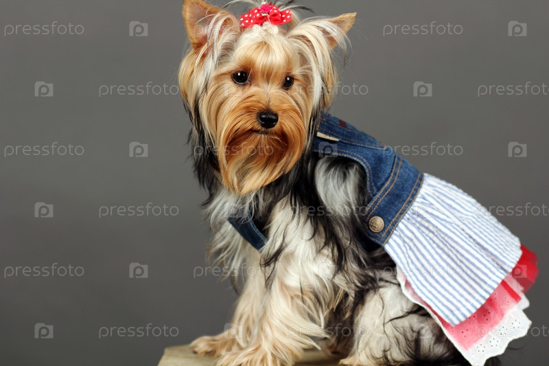 Йоркширский терьер в платье на сером фоне