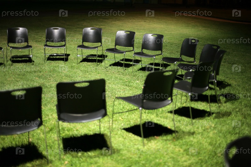 Черные стулья на зеленой траве, ночь