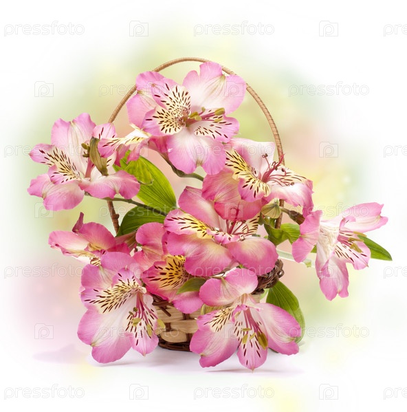 Красивые розовые цветы в корзине на абстрактном фоне