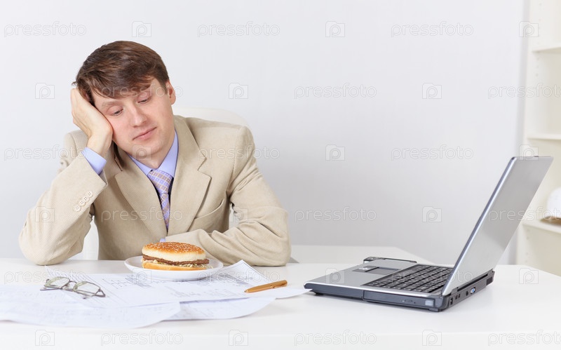 Молодой бизнесмен, мечтательно глядя на бутерброд