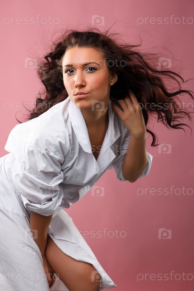 Девушка в белом халате позирует перед камерой