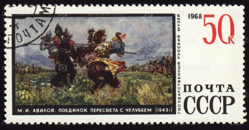 Марка с изображением картины Авилова " Поединок Пересвета с Челубеем "