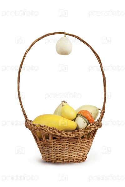 Свежие фрукты и овощи в корзине на белом фоне