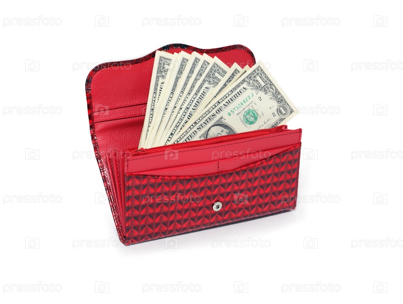 Женский кожаный кошелек с американскими долларами на белом фоне
