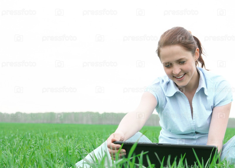 Молодая красивая девушка с ноутбуком на открытом воздухе
