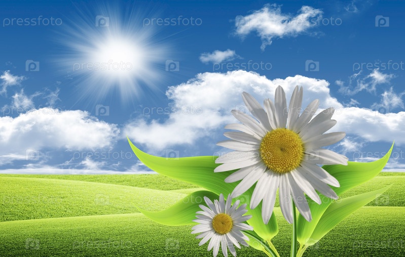 Белые ромашки на фоне красивого голубого неба, иллюстрация