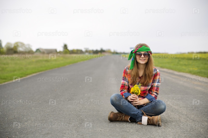 Девушка на дороге с желтыми цветами в руках