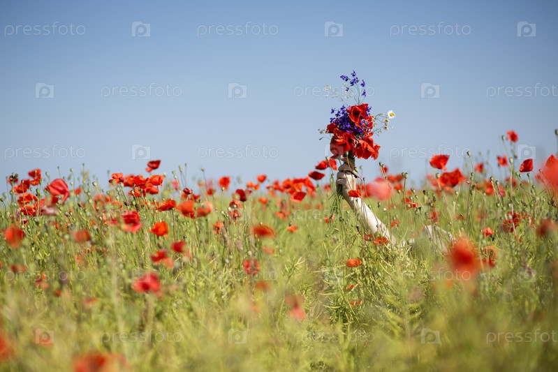 Девушка в поле с цветущими маками