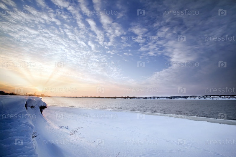 Красивый закат над зимней рекой