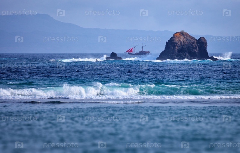 Старая шхуна возле скалы в море. Индонезия, Бали