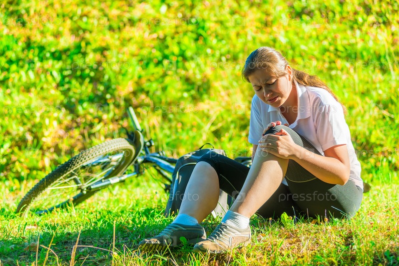 Велосипедистка держит ушибленное колено
