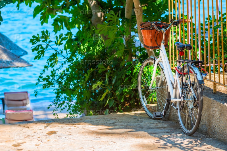 Белый велосипедов на стоянке возле моря