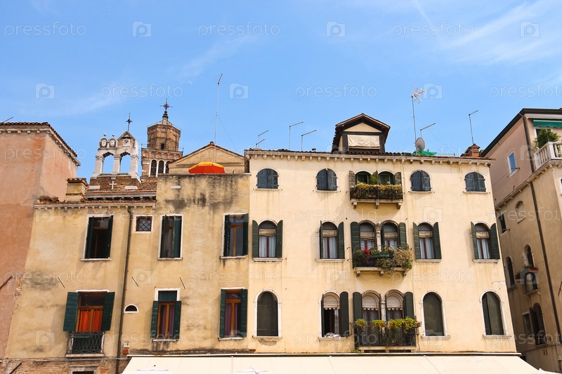 Живописный итальянский дом на фоне церкви Санта-Мария Глориоза деи Фрари, Венеция, Италия