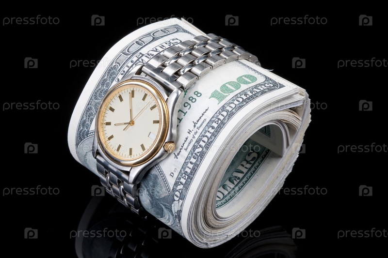 Свернутые долларовые банкноты и часы на черном стеклянном фоне