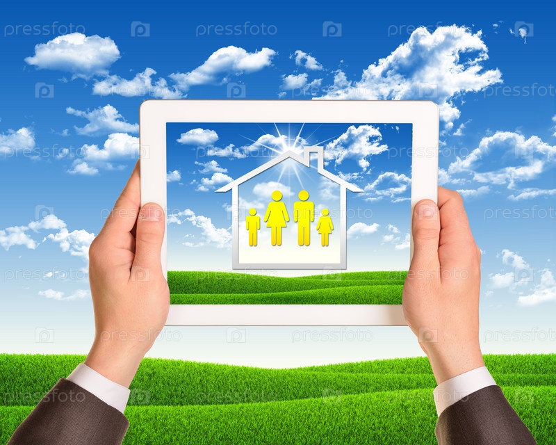 Руки держат планшетный компьютер с изображением дома и семьи