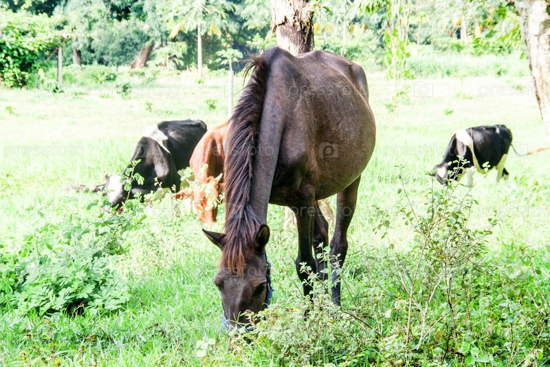 Лошадь и коровы на ферме в Таиланде