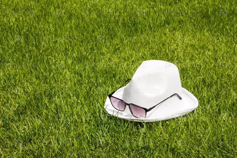 Белая шляпа и солнцезащитные очки на траве