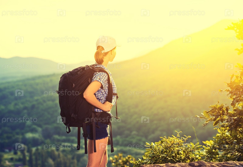 Женщина с рюкзаком на вершине горы