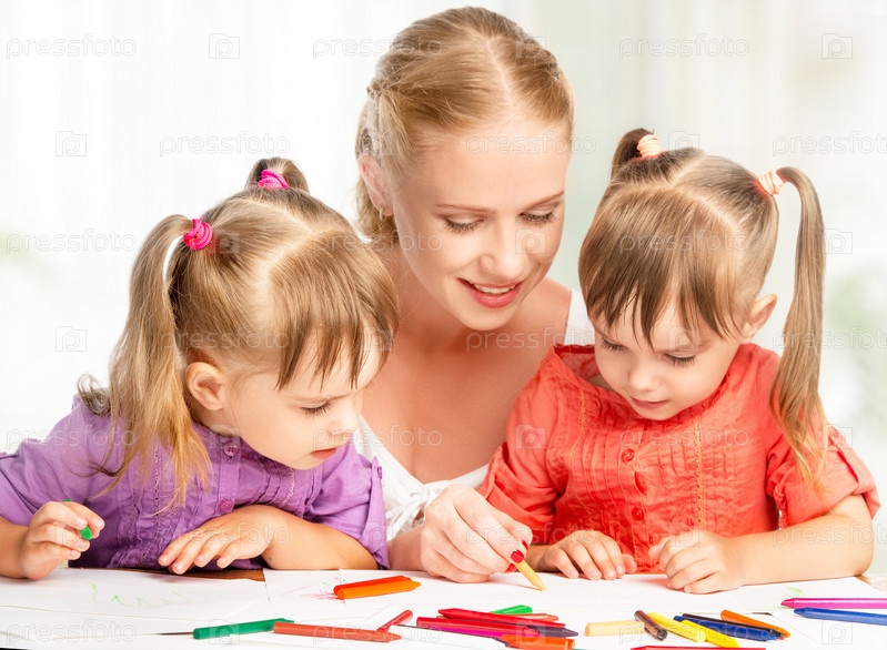Сестры-близнецы рисуют с матерью