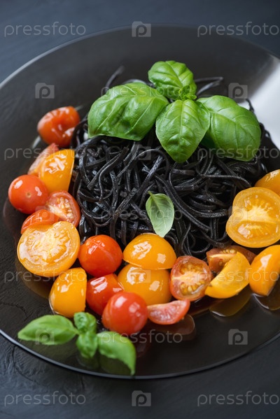 Черные тальятелле с обжаренными помидорами