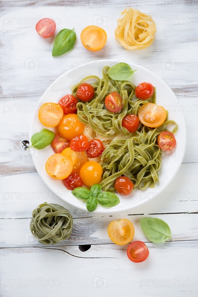 Цветные тальятелле и жареные помидоры