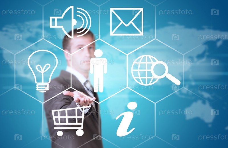 Деловой человек указывает пальцем на значки