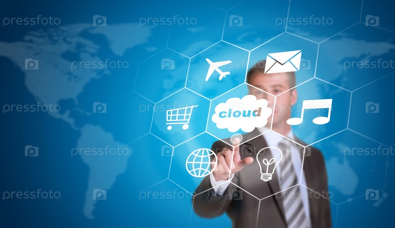 Деловой человек указывает на облако с иконками