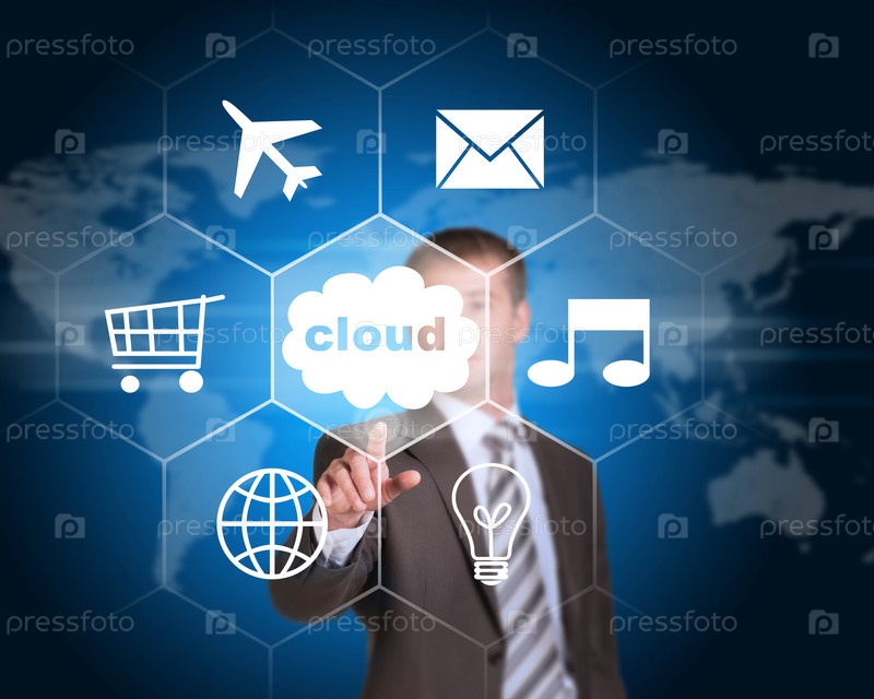 Деловой человек указывает на облако с иконками
