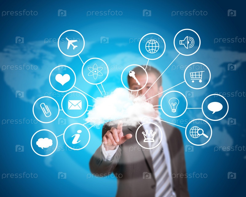 Деловой человек указывает на облако с иконками