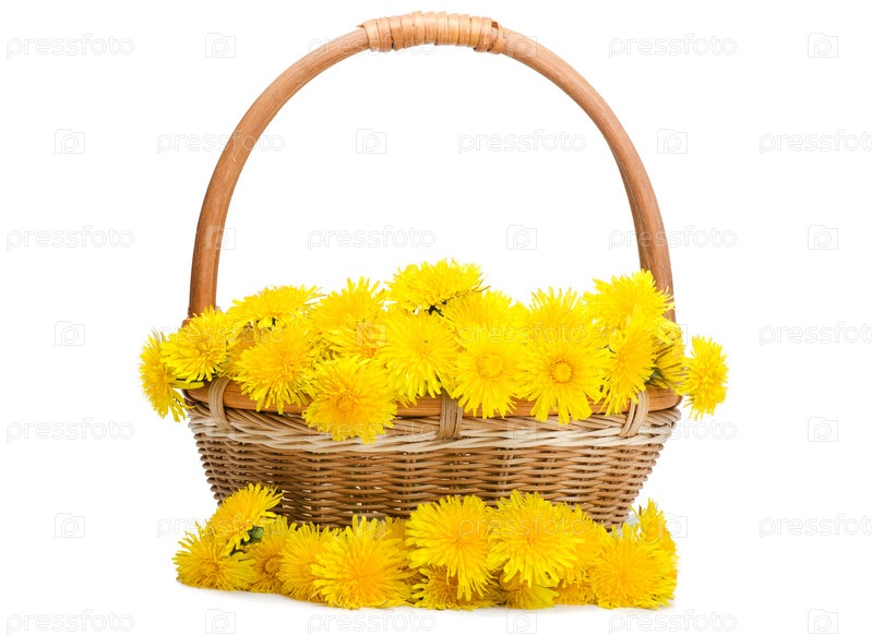Плетеная корзина с желтыми одуванчиками на белом фоне