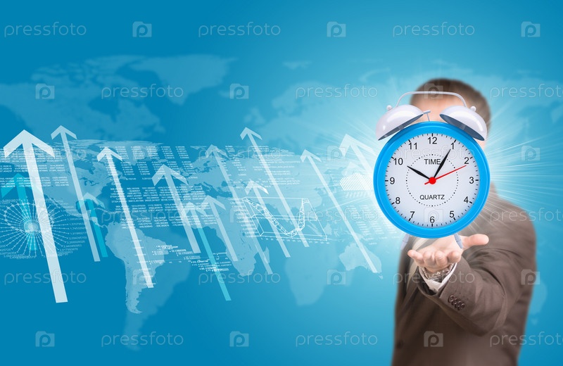 Деловой человек держит будильник