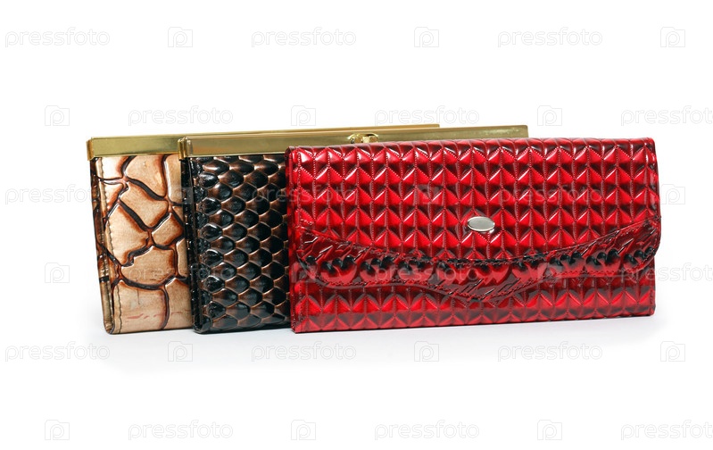 Три разных кожаных кошелька на белом фоне
