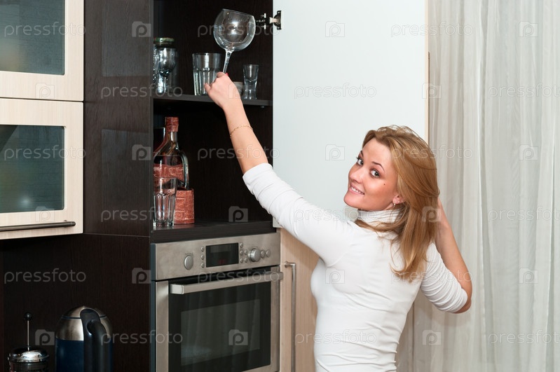 Молодая улыбающаяся женщина в кухне с бокалом в руке