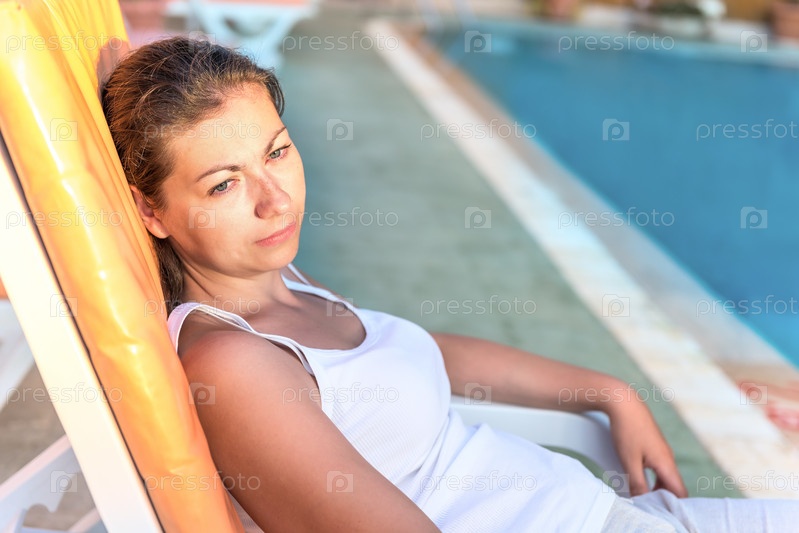 Девушка отдыхает на шезлонге у бассейна