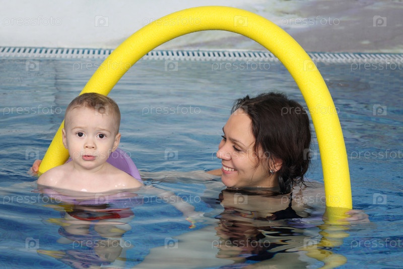Мама с сыном плавают в бассейне