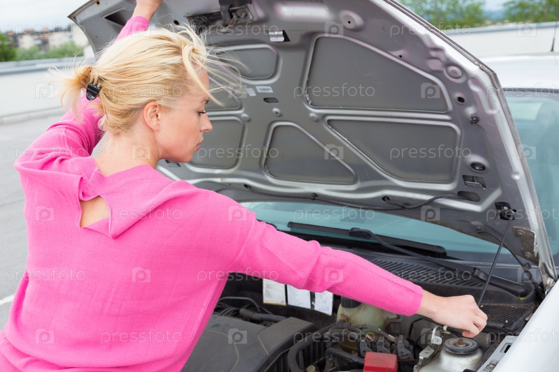 Молодая женщина со сломанным автомобилем