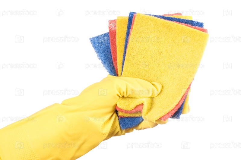 Рука в резиновой перчатке с тряпками на белом фоне