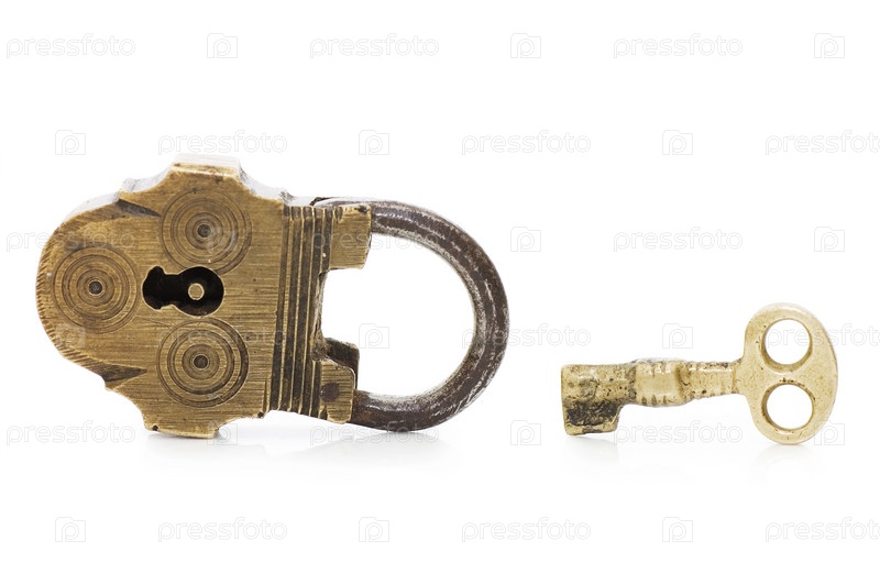 Старый замок и ключ на белом фоне