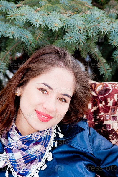 Молодая красивая девушка в кресле на фоне голубой ели