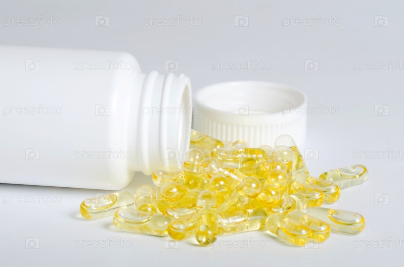 Опрокинутый бутылек с капсулами на белом фоне